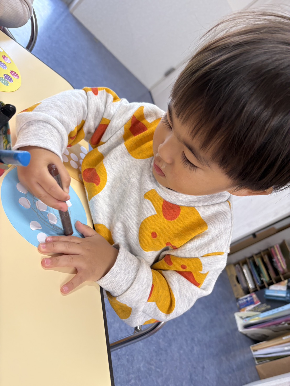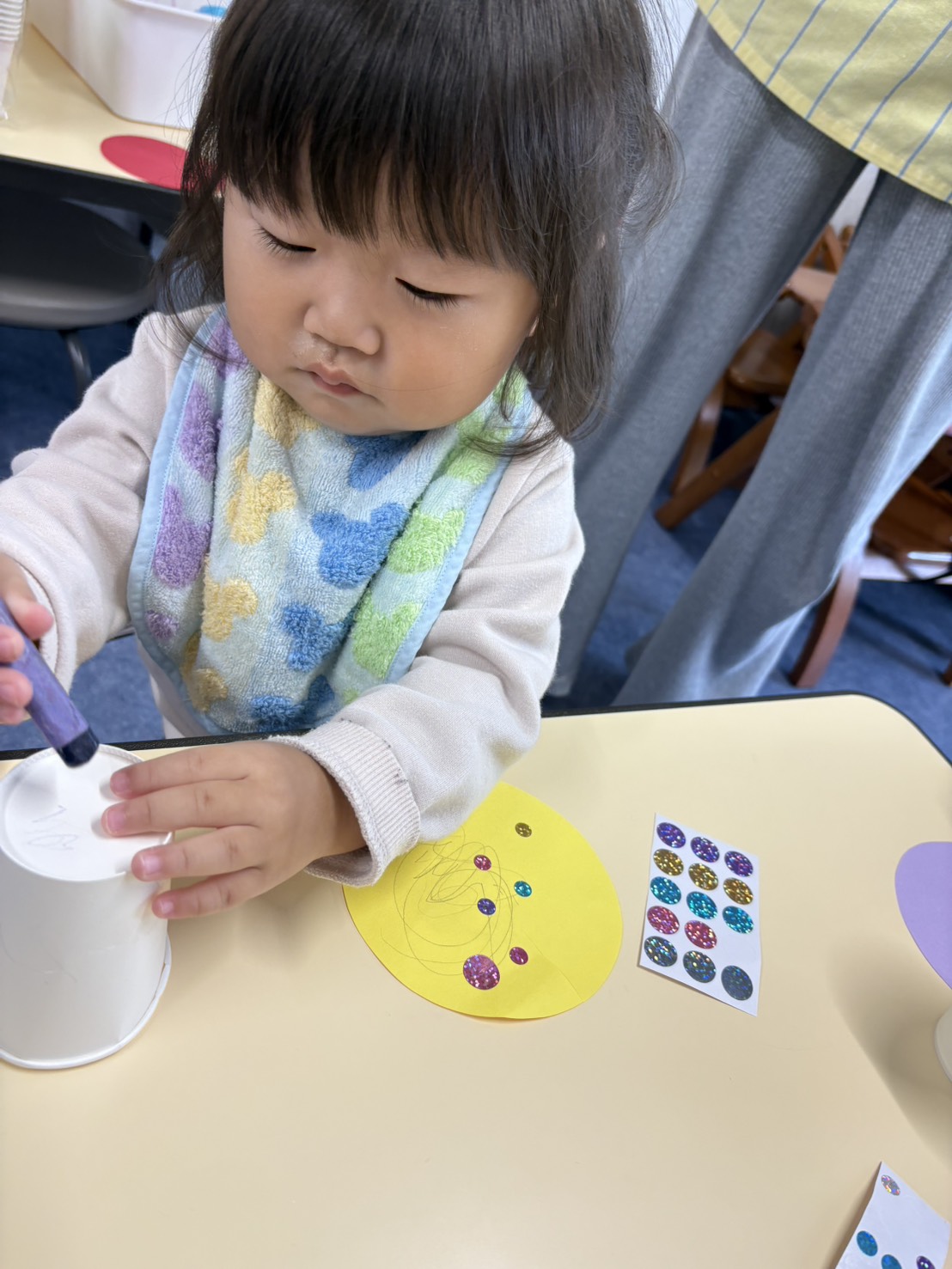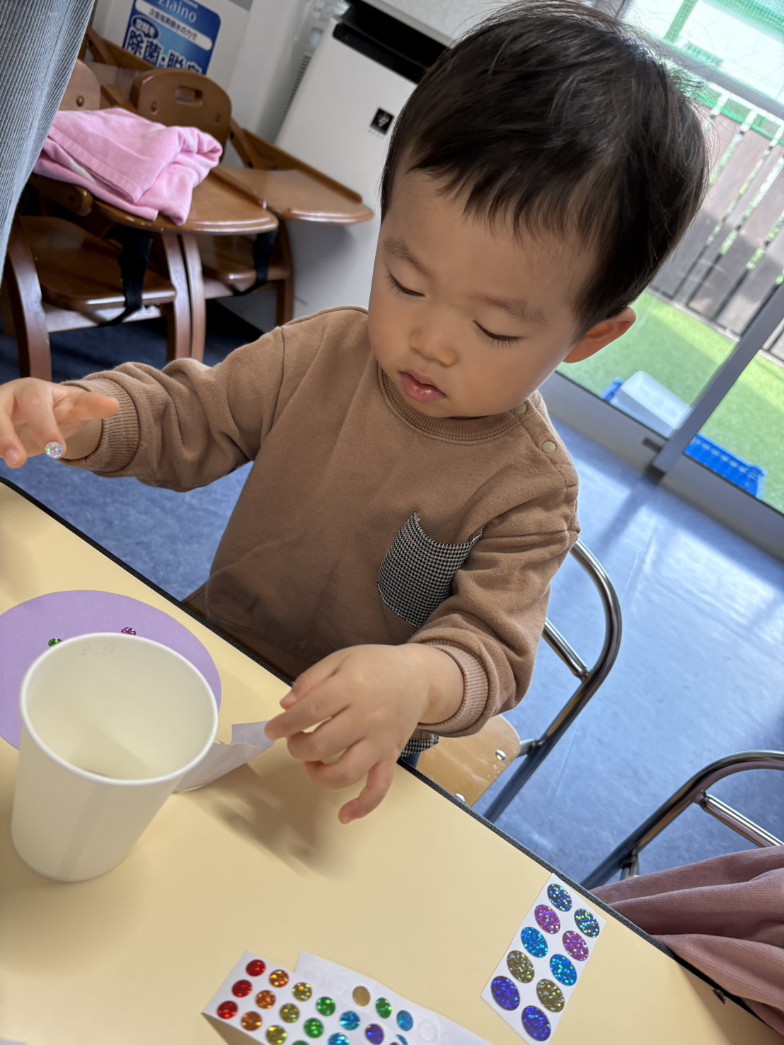 シールを貼ったり指先で細かい作業をする中で、手先の感覚や集中する力も育まれています。