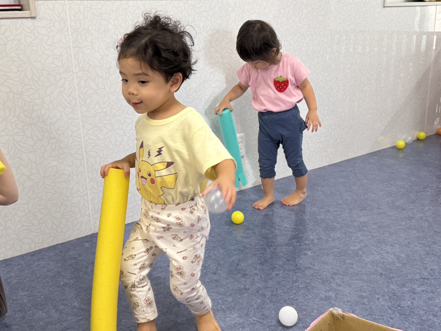 今日は感覚統合あそびとして、プールスティックを使ってボールを掴むあそびを行いました。